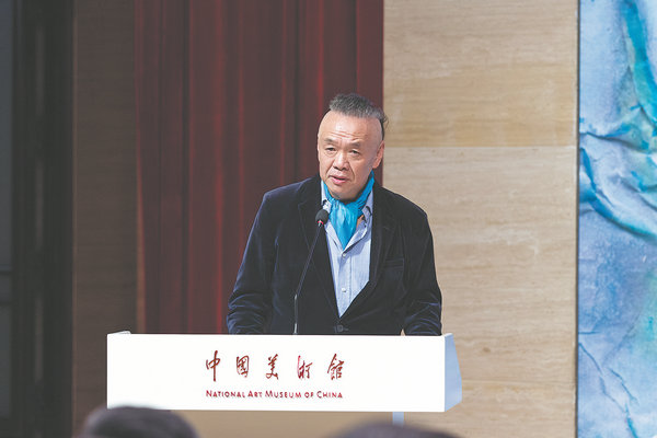 Veteran painter Xu Dongdong at the opening of his ongoing exhibition, titled Dialogue of Civilizations and Inquiries into Life, at the National Art Museum of China through to Nov 6. [Photo provided to China Daily]
