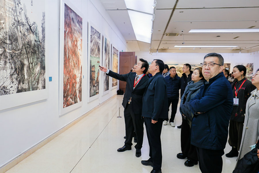 Liu Liyong (first from left) showcases paintings to visitors at the Shijiazhuang Art Museum. [Photo provided to chinadaily.com.cn]