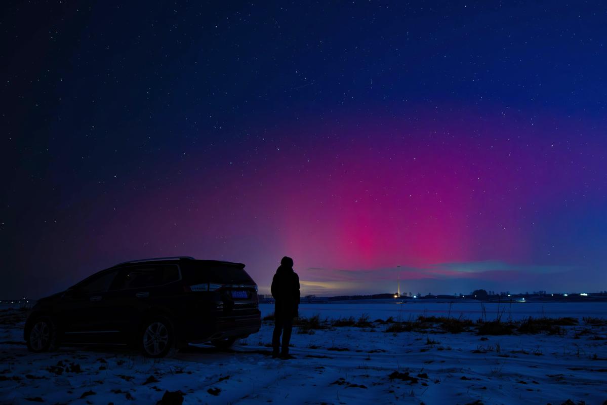 This photo taken on Nov 12, 2025 shows a person watching the aurora in Heihe city, Northeast China's Heilongjiang province. [Photo/Xinhua]