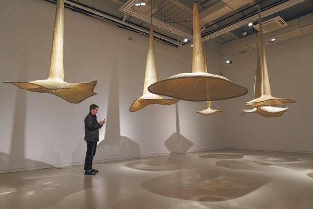 Their work consists of tens of thousands of synthetic yellow blossoms floating high in the air without roots or branches.