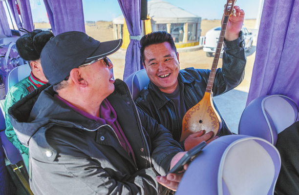 "Our performances go to every place where herders live," Oyunjargal says. He and fellow troupe members load their instruments and sound equipment onto a flow stage bus and drive to a border guard station, bringing cultural performances to border patrol stations and remote herding communities.