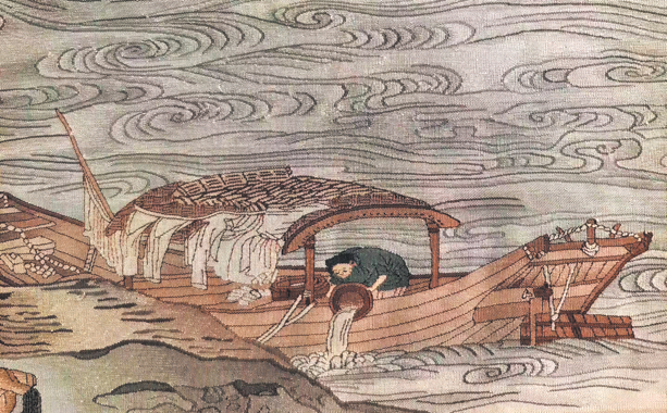 A close-up of the kesi artwork of the scroll painting, Along the River During the Qingming Festival. The silk scroll showcases more than 800 characters, numerous buildings, and bustling life details. CHINA DAILY