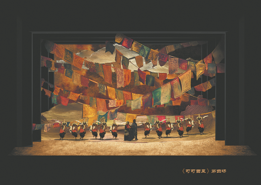 Visual representations of the set design of the Chinese opera Hoh Xil, featuring elements of the natural sceneries of the pristine remote landscapes and the cultural symbols of the region, such as Tibetan folk dance and the endangered Tibetan antelope. CHINA DAILY