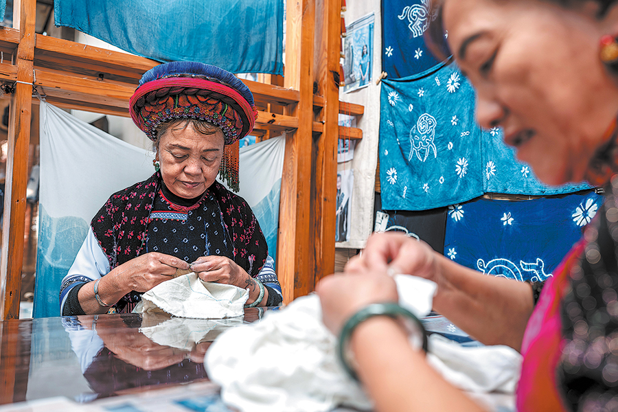 Two Bai tie-dye inheritors knot fabrics in a Zhoucheng workshop, keeping the ancient skill alive.[Photo by Hu Chao/Xinhua]