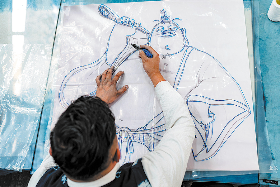To make the traditional art appealing to younger generations, Duan Yuan incorporates modern motifs, including cartoon characters, into new designs.[Photo by Hu Chao/Xinhua]