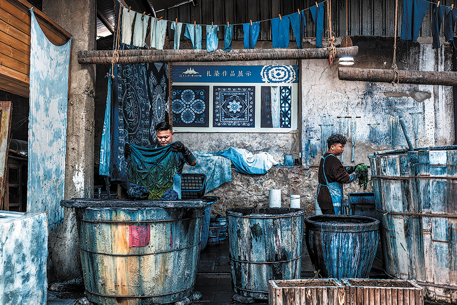 Traditional dye is prepared in the workshop by mixing indigo leaves with wild plants.[Photo by Hu Chao/Xinhua]