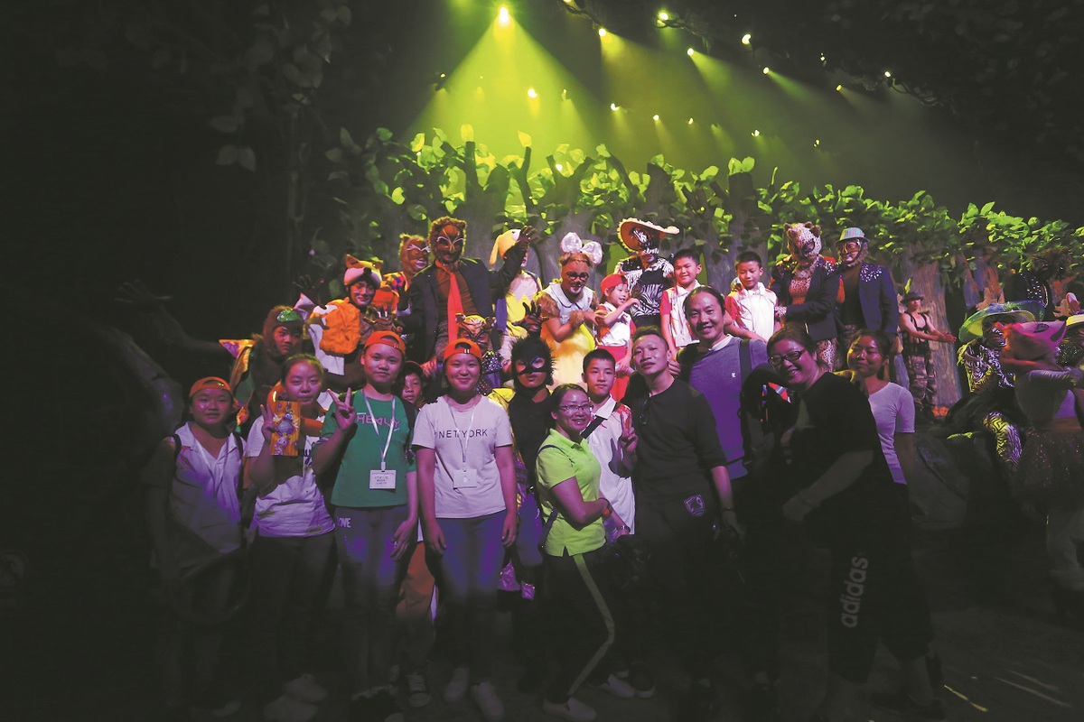 Li Bo (front row, third from right) and Zhang Yong (front row, second from right) pose for a photo with child members of the Silence Choir at Happy Valley amusement park in Beijing in 2018. [Photo provided to China Daily]