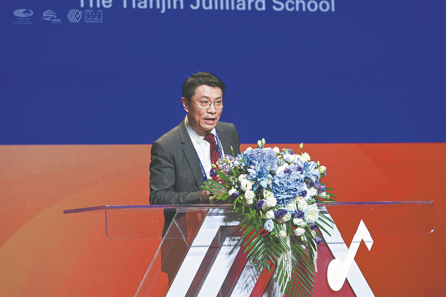 He Wei, CEO and artistic director of the Tianjin Juilliard gives a speech during the 2025 Beijing Forum for Symphonic Music. CHINA DAILY