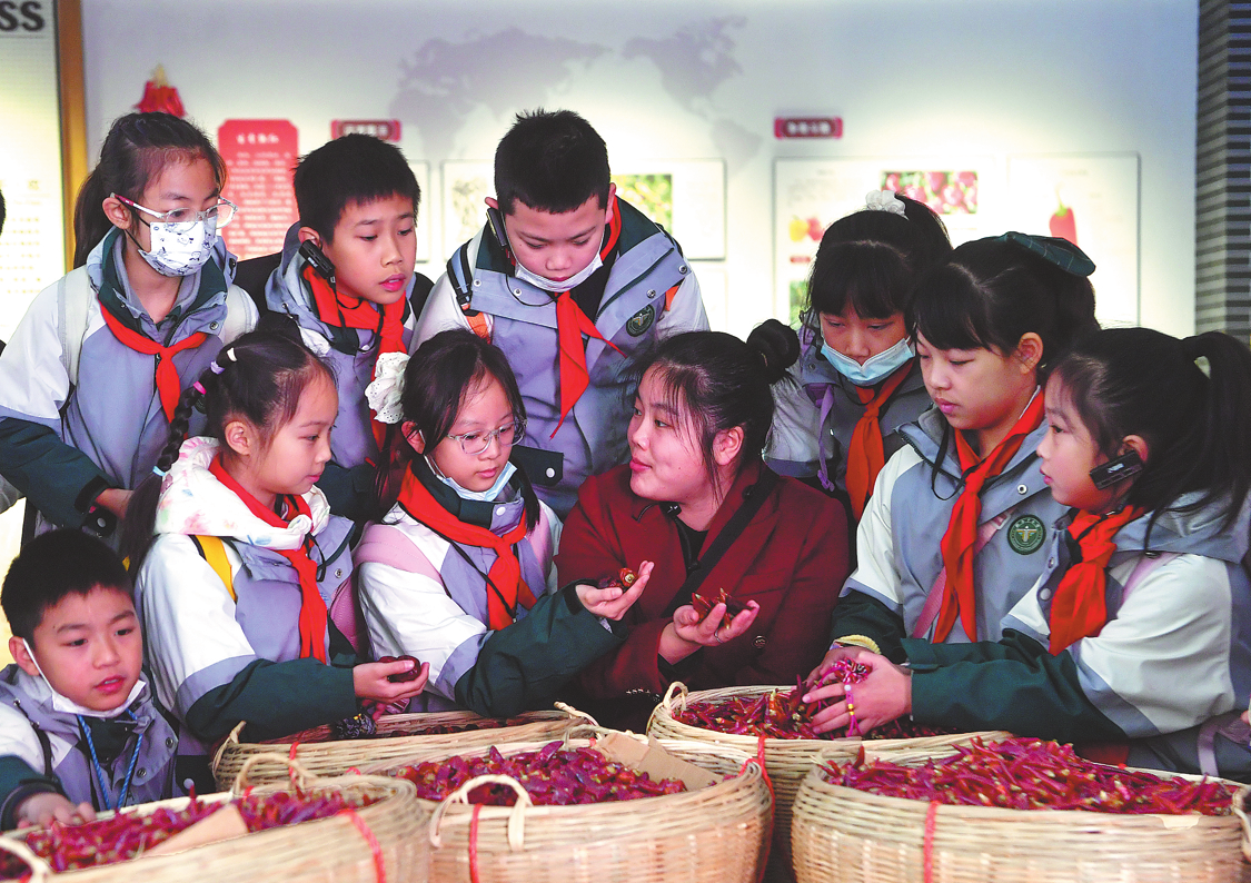 Students from Chongqing participate in a study tour in November at the Zhoujunji Hotpot Seasoning History and Culture Museum in Zhoujunji Hotpot Food Industrial Park, where they learn to identify different types of chili peppers used in hotpot (top), create their own hotpot base (above left), and explore various hotpot side dishes. ZHOU BANGJING/FOR CHINA DAILY