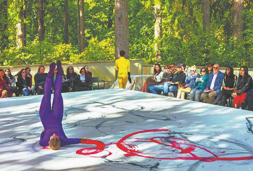 At the opening event at the Katonah Museum of Art, Shen Wei Dance Arts performed excerpts from the 2004 creation Connect Transfer. Dressed in blue, pink, yellow and purple, the dancers' bodies dipping in multicolored paint leave their marks on the canvas floor, creating a colorful abstract painting.