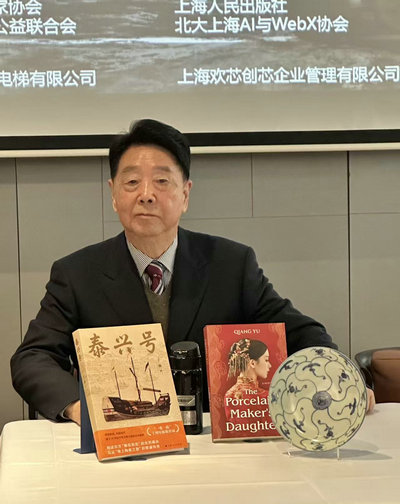 Yu Qiang with his works,  The Tek Singand its English edition,  The Porcelain Maker's Daughter [Photo provided to chinadaily.com.cn]