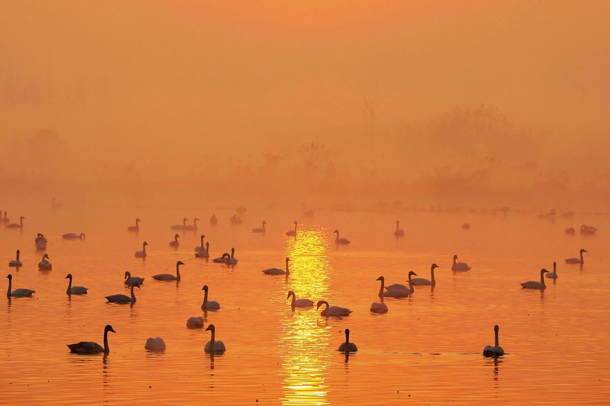 Large numbers of tundra swans are seen wintering at the Donggu Lake wetland in Yueyang, Hunan province, drawing crowds of visitors and photographers. [Photo by Zhou Yang/for chinadaily.com.cn]