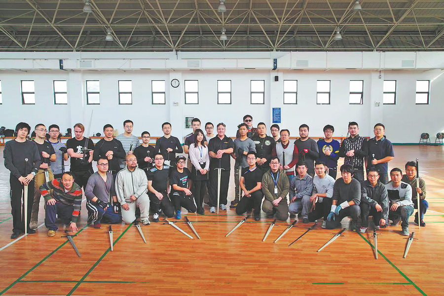 At Shanghai Historical Martial Arts Club, students and a German teacher pose for a group photo after class in Shanghai. [Photo/Xinhua]