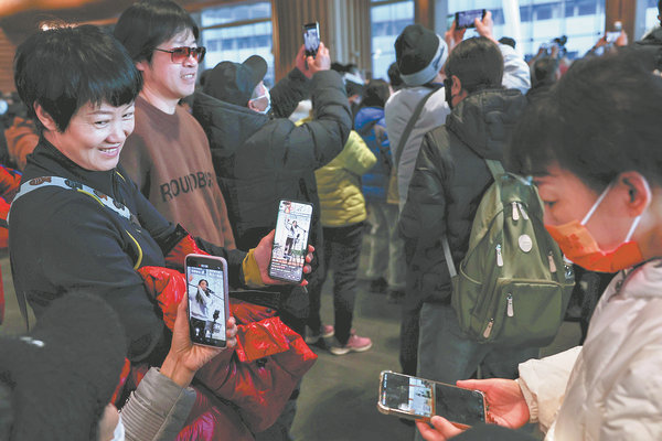 Several audience members who don't have good viewing spots watch the livestream on their phones. [Photo/XUE JUN/FOR CHINA DAILY]