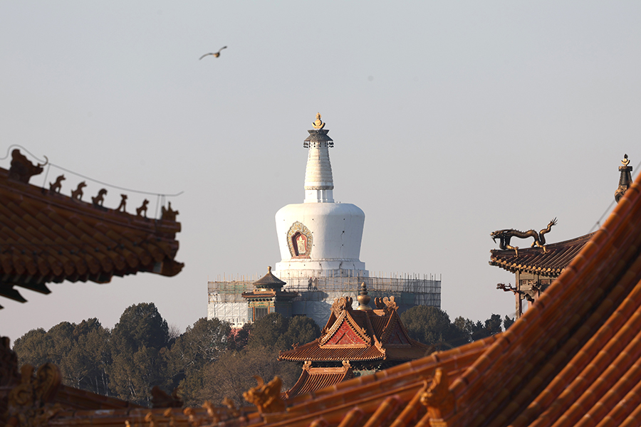 Workers carry out construction on the White Dagoba of Yong'an Temple in Beihai Park, Beijing, on December 21, 2025. [Photo by Zou Hong /China Daily]