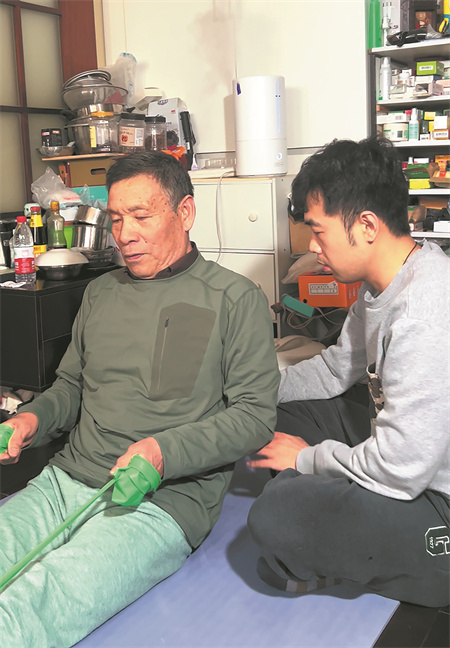 Li Xuan (right) assists a 77-year-old in strength training.[Photo provided to China Daily]