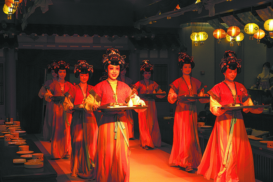 Nearly 1,500 kilometers to the northwest, in the ancient capital of Xi'an in Shaanxi province, a Tang Dynasty (618-907) scene also comes to life over the dining table.