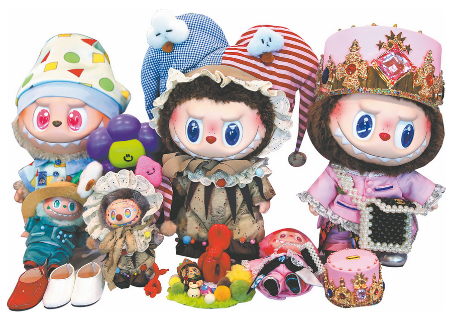 Recreations of Pop Mart's Labubu toys, creatively styled with various doll outfits, are showcased at a trendy collectibles expo in Shanghai in July. [Photo provided to China Daily]