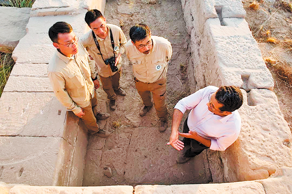 Gao (left) and other members of the Chinese-Egyptian joint archaeological team discuss the site they are working on in Egypt in 2018.[Photo provided to China Daily]