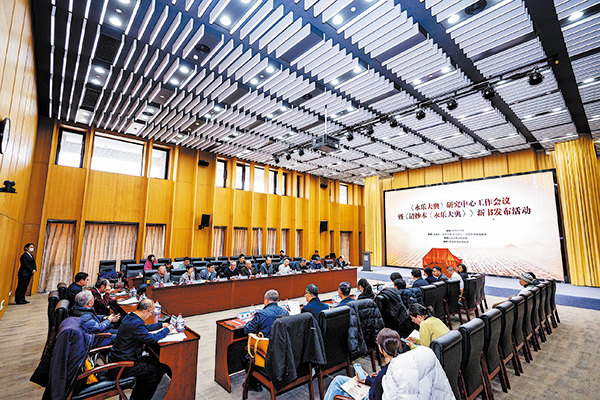Experts gather to discuss the preservation efforts of Yongle Dadian at the launch ceremony of the Qing Dynasty Manuscript Copies of the Yongle Dadian at the National Library of China in Beijing in mid-January.[Photo provided to China Daily]