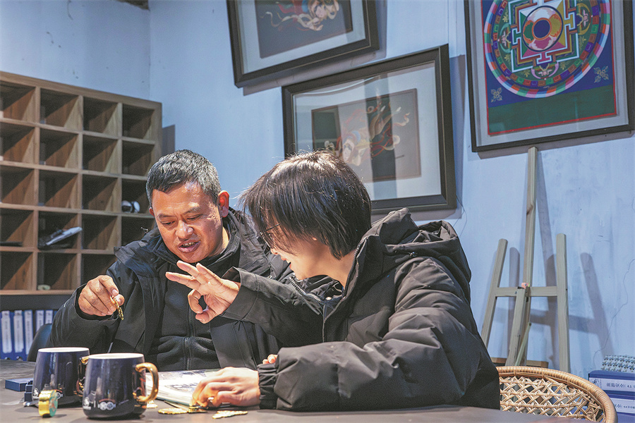 Yang (left) discusses ideas for cultural creative products inspired by the museum's murals and architecture with a colleague.[Photo provided bu Gao Yongwei/Wang Guansen/Xinhua]