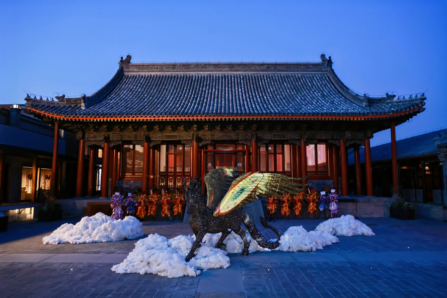 A massive 2.83-meter-tall woodcarving dragon horse is on show at the Hong’en Temple in Beijing to celebrate the upcoming the Year of the Horse. [Photo provided to chinadaily.com.cn]