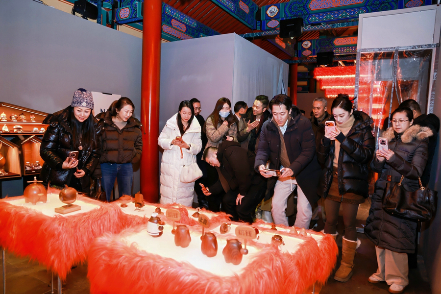 Guests take pictures of artist Huang Wangwang’s woodcarving works at the opening of Gallop Forward!, an exhibition honoring the Year of the Horse at the Hong’en Temple in Beijing on Jan 24, 2026. [Photo provided to chinadaily.com.cn]