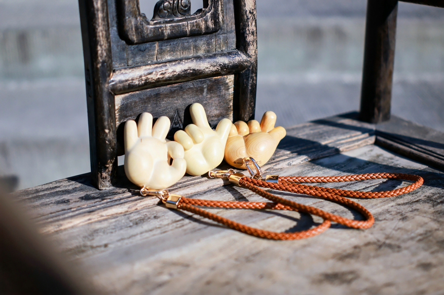Adorable sign-language bag charms handcrafted by hearing-impaired artisans using traditional woodcarving techniques. [Photo provided to chinadaily.com.cn]