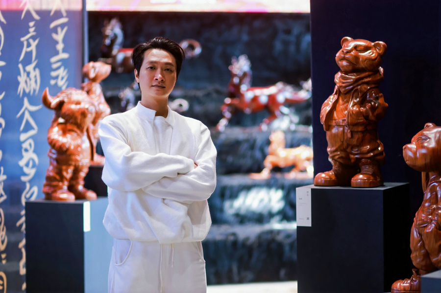 Artist Huang Wangwang poses for a picture with his Zodiac Animal series at the Hong’en Temple in Beijing on Jan 24, 2026. [Photo provided to chinadaily.com.cn]