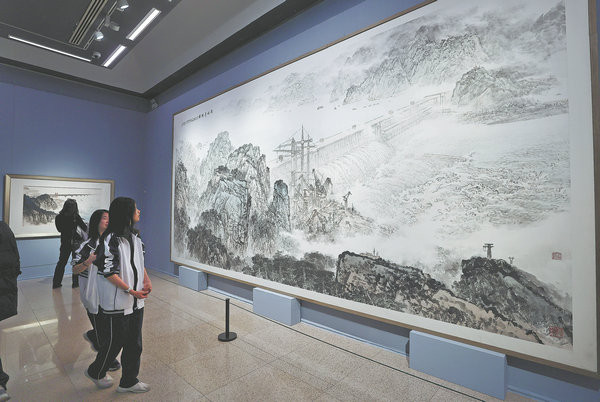 High Gorges and Flat Lake, a landscape painting by Shi Jiangcheng and Zhang Jun, is a highlight of the exhibition Clear Waters Flow Eastward at the National Art Museum of China in Beijing. [Photo by Jiang Dong/China Daily]