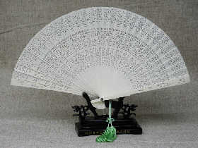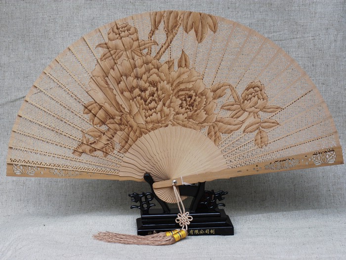 Openwork Sandalwood Fan with Pyrographs of Peony