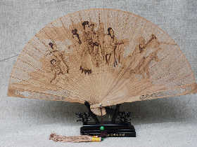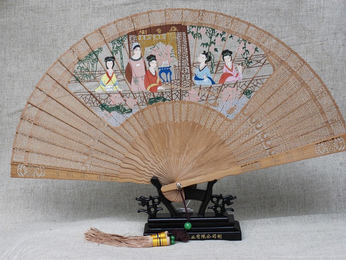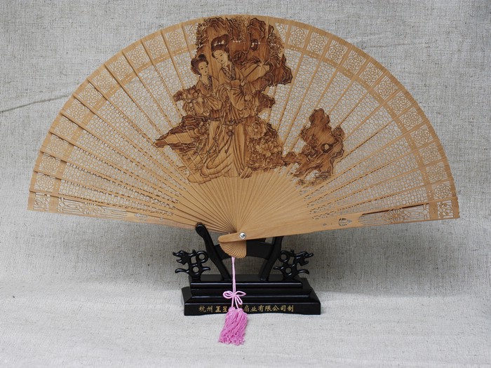 Openwork Sandalwood Fan with Pyrographs of Beauties