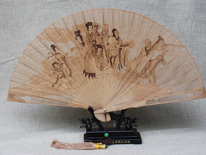 Openwork Sandalwood Fan with a Pyrographed Scene of the Eight Immortals Crossing the Sea