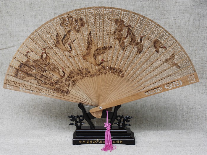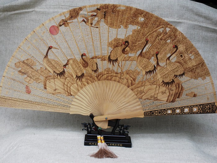 Openwork Sandalwood Fan with Pyrographed Pine and Cranes