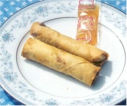 These delicate spring rolls are filled with shredded pork, shrimp, black mushrooms and garlic chives.