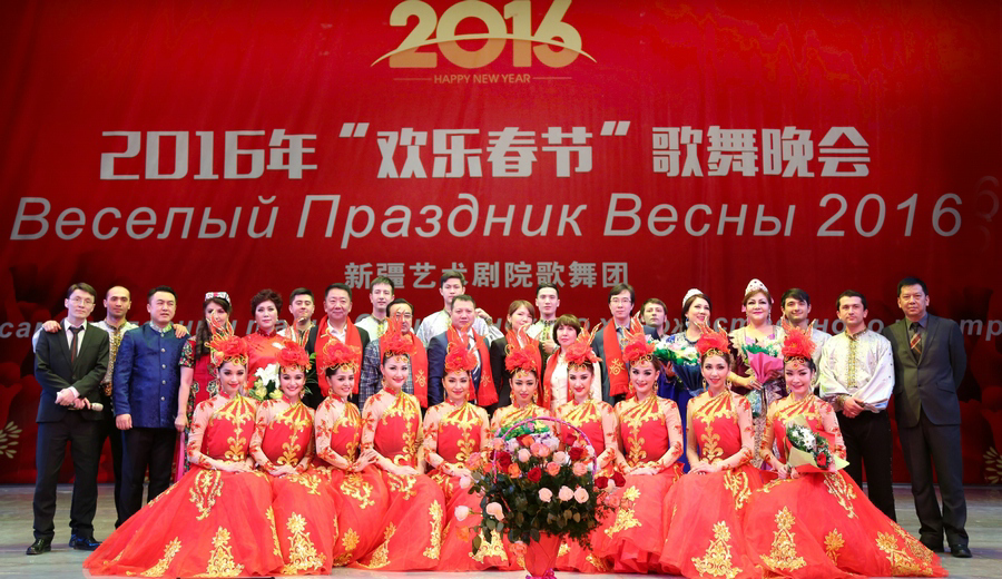 Officials and artists pose for a photo at the "Happy Chinese New Year" gala in Almaty in Kazakhstan, Feb 9, 2016. [Photo/almaty.chineseconsulate.org] |