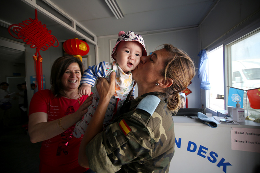2016年春节,中国驻黎巴嫩大使馆到维护部队慰问维和官兵,图中我们中国的小孩成为大家争相拥抱的吉祥娃娃。