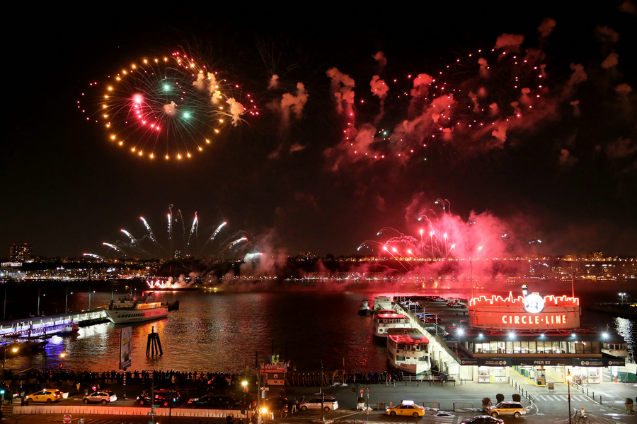 中国高等艺术学府中央美术学院与美中文化协会联合承办的2016年 “欢乐春节·艺术中国汇” 纽约系列活动2月6日正式开幕,图为当晚在纽约哈德逊河举行的盛大的春节焰火晚会。[摄影:管黎明] Fireworks to celebrate Chinese New Year on Hudson River in New York on Feb 6. [Photo by Guan Liming]