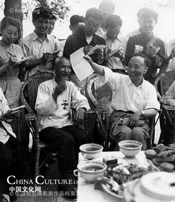 Guo Moruo (front right), vice-chairman of the National People's Congress of the People's Republic of China, shares poetry with villager Wang Laojiu in May 1958. Mao Songyou/Xinhua News Agency