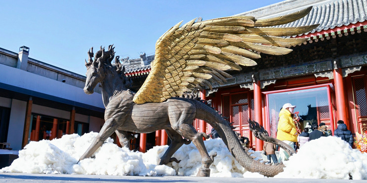 In Chinese mythology, the longma (dragon horse) is a legendary winged creature covered in dragon scales. Now, a massive 2.83-meter-tall woodcarving of this fabled beast has taken center stage at the 700-year-old Hong'en Temple in Beijing's Dongcheng district.