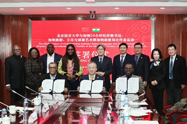 A high-level Ghanaian delegation led by Augustus Obuadum Tanoh, presidential adviser for the 24-Hour Economy Secretariat of Ghana, visited Beijing Language and Culture University (BLCU) on Jan 19, where they were welcomed by Duan Peng, president of the university.