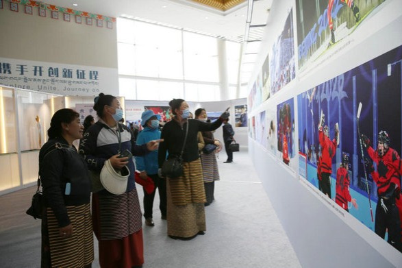 Supported by the Beijing Olympic City Development Promotion Association, a touring exhibition highlighting the spirit of the Beijing Winter Olympics arrived in Lhasa, Tibet autonomous region, on Wednesday.