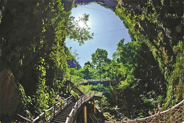 The Mianhua Sinkhole in Mianhua village of Luocheng Mulam autonomous county, Guangxi Zhuang autonomous region, has been developed into a tourist resort featuring geological wonders and ethnic cultures.