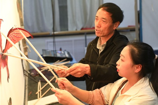 This is a Daoqing shadow puppetry class at Longdong University in Northwest China's Gansu province. Aside from Liu, the 30-plus performers of the show are all college students with an average age of around 20.