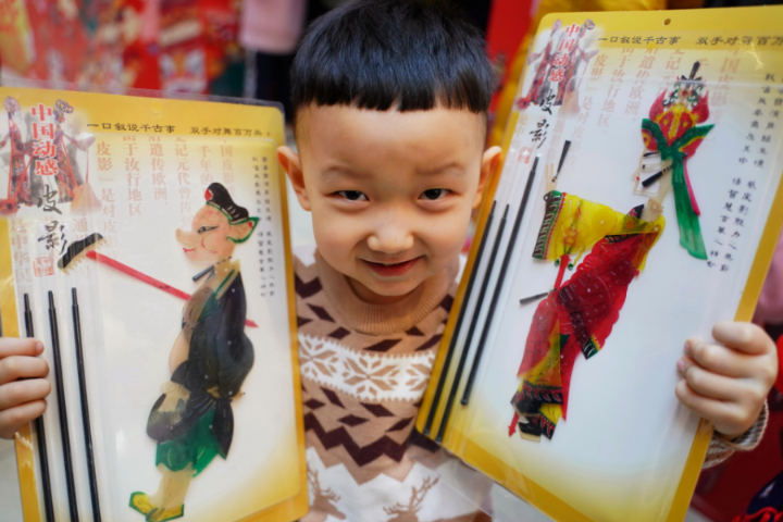Visitors get into the holiday spirit by making sugary treats and dough figurines in a traditional manner and appreciating shadow puppetry (above) at a fair dedicated to cultural heritage held during Spring Festival in Qianan, Hebei province.