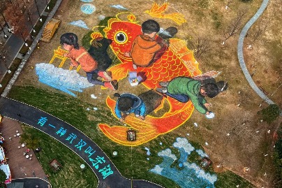 WUHAN-Looking down from the hot air balloon, tourists are amazed by a painting covering the floor in the East Lake scenic area in Wuhan, capital of Central China's Hubei province.