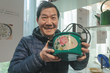 A four-piece set of enameled steel ware, including basins and a chamber pot, used to cost three and a half months' salary of an ordinary worker in Shanghai, Xie Dangwei says, while pointing at a set of dowry offerings featured in his exhibition of enamel works.