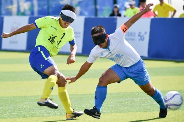 NANJING-On a damp and cold day in eastern China, Chen Shanyong wears a blindfold and surges forward on a soccer pitch, making a powerful volley after perfectly dribbling the ball into the box.