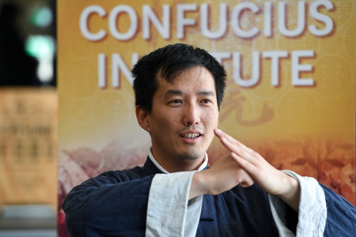 Martial arts teacher Meng Fanxiao demonstrates kung fu at the library of Victoria University in Wellington, New Zealand on Sept 22, 2020.
