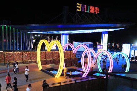 As night falls, a food street where snack stands are made from shipping containers starts business at Huaxi Live Wukesong, a comprehensive modern shopping mall in Beijing's Haidian district.